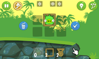 Einzelteile wie Holzkisten, Rollschuhräder, Blasebälge und Fahrer-Schwein zieht man bei Spielstart von Bad Piggies in graue Felder. Das fertige Gefährt muss möglichst stabil sein. Mit 33 verschiedenen Spezialteilen wie Motoren, Flügel oder Ventilatoren verwandelt der Spieler einfache Holzkarren in mächtige Fluggeräte. Fertige Entwürfe kauft man sich auf Wunsch über eine kostenpflichtige Funktion.